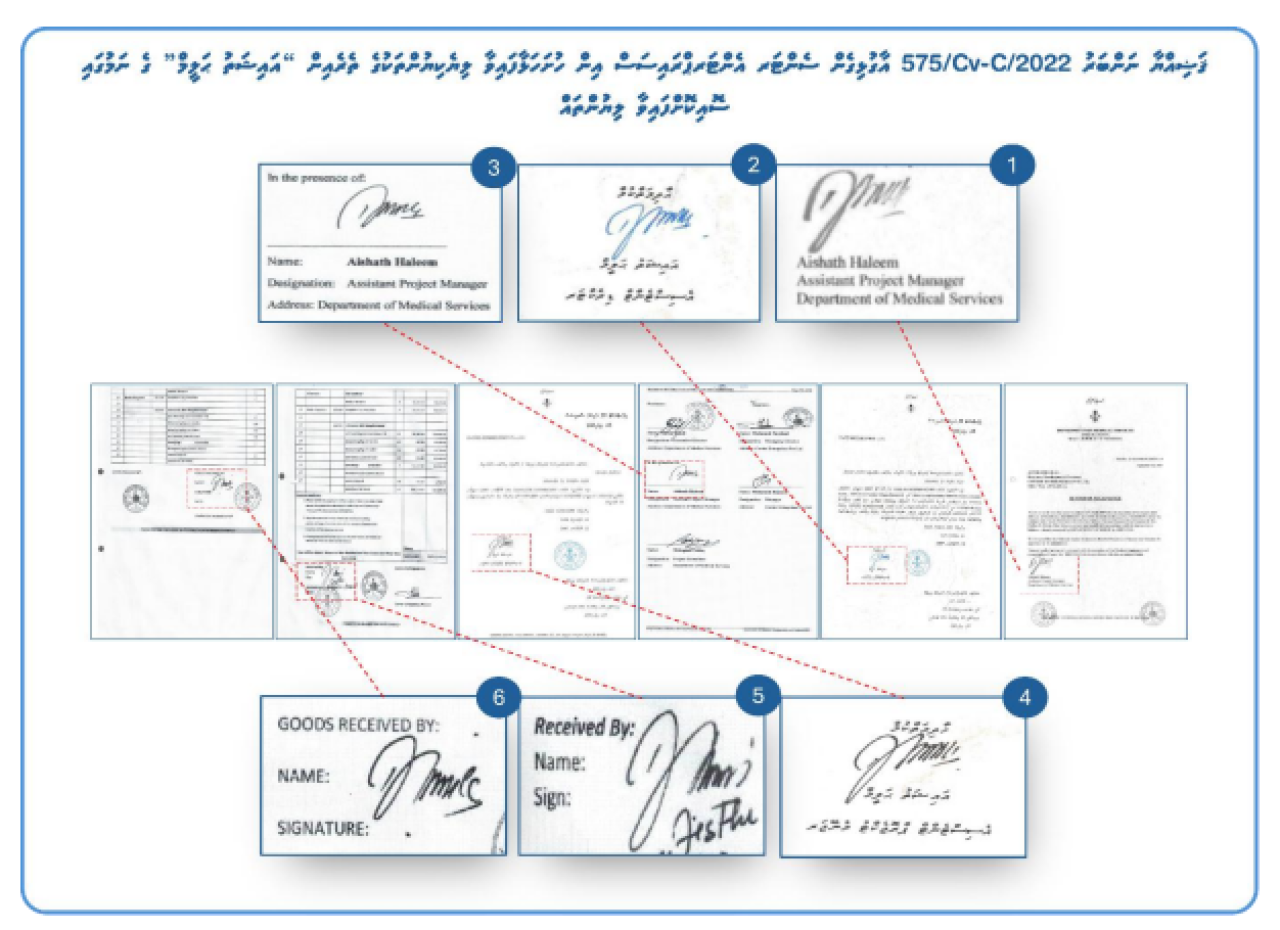 - މި މައްސަލައާއި ގުޅިގެން ސެންޓަ އެންޓަޕްރައިސަސްއިން ކޯޓަށް ހުށަހަޅާފައިވާ ބައެއް ލިޔެކިޔުންތަކުގައި ޑީއެމްއެސްގެ އެސިސްޓެންޓް ޕްރޮޖެކްޓް މެނޭޖަރުގެ ގޮތުގައި "އައިޝަތު ހަލީމް"ގެ ނަމުގައި ސޮއިކޮށްފައިވީ ނަމަވެސް އެ ނަމުގައި އެއްވެސް އިރެއްގައި ޑީއެމްއެސްގެ މުވައްޒަފެއްގެ ގޮތުގައި މަސައްކަތް ކޮށްފައި ނުވުން