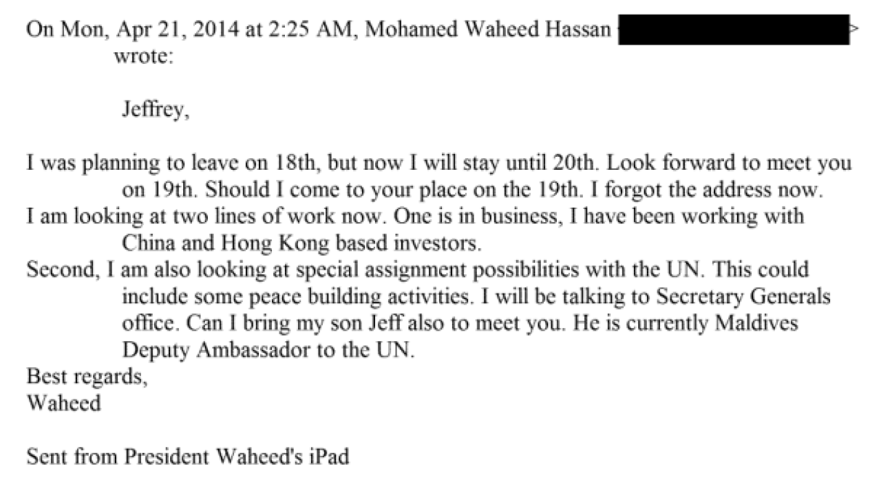 ކުޑަކުދިންގެ ވިޔަފާރި ކޮށް އެކުދިންގެ ފަރަތުން ޖިންސީ ޣަރީޒާ ފުއްދަމުން ދިޔަ ބިލިއަނަރު ޖެފްރީ އެޕްސްޓީން ފައިލްސް ގައި ޑރ. ވަހީދުގެ ނަން 244 ފަހަރު ފާހަގަ ކޮށްފައި ވެއެވެ.