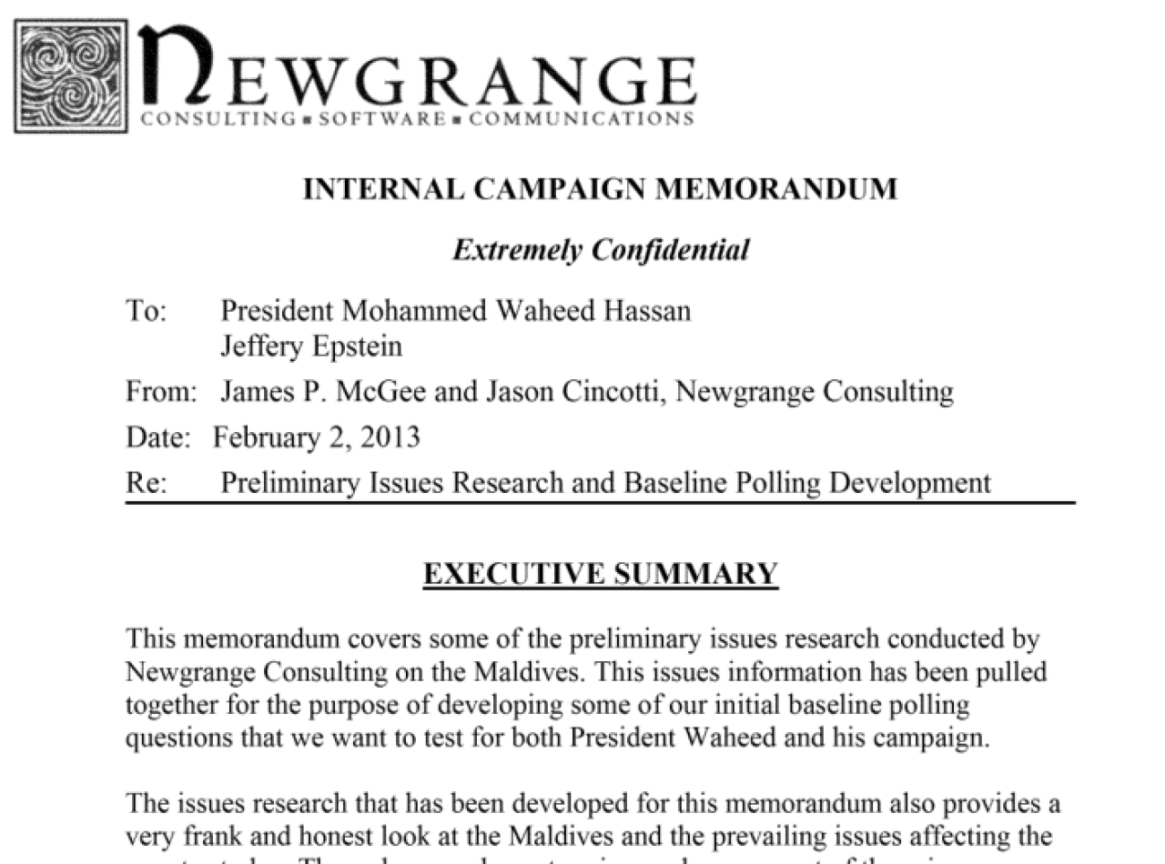 މާޗް 26، 2013 ގައި ޖޭމްސް ޕީ.މެގީ ކިޔާ މީހަކާއި ވަހީދުއާ ދެމެދު ކުރެވިފައިވާ މުއާމަލާތަކަށް ބަލާއިރު، ދައްކަވާފައި ވަނީ ރާއްޖޭގެ ހާލަތު ދެނެގަތުމަށް ކުރާ ސާވޭއެއްގެ ވާހަކަ އާއި ހާއްސަކޮށް ރައީސް ނަޝީދާއި ސިޔާސީ މަޝްރަހަށް އަންނަމުންދާ ބަދަލުތަކުގެ ވާހަކައެވެ.