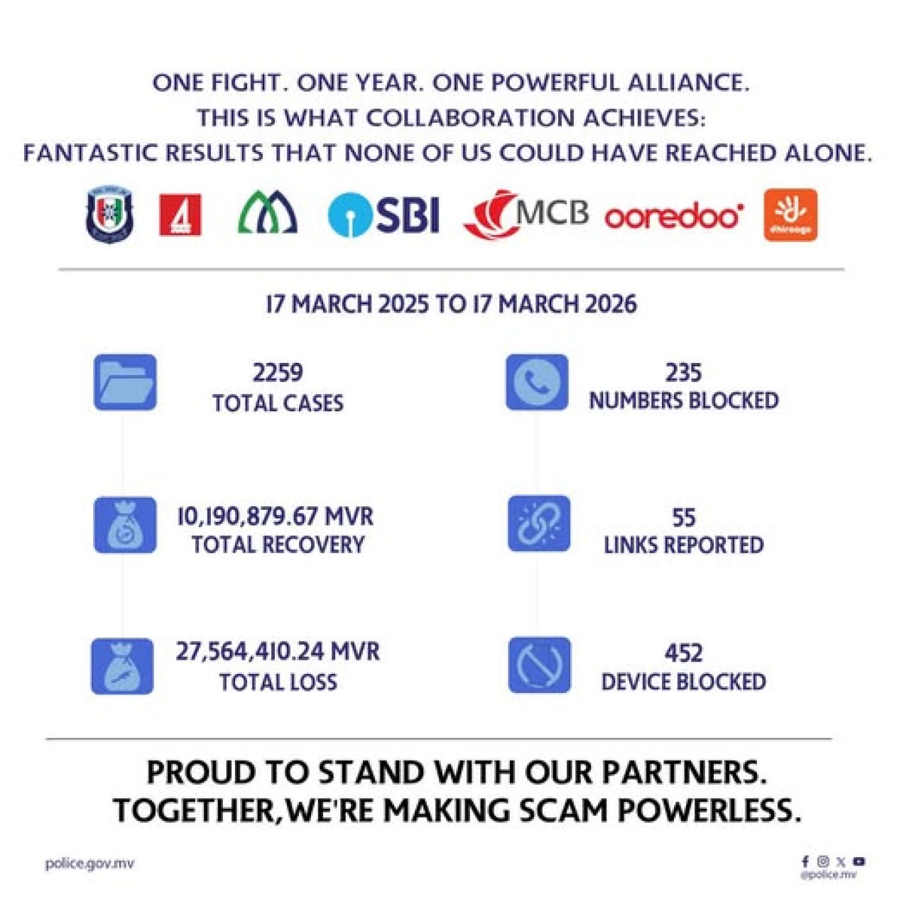 ފާއިތުވި 12 މަސްދުވަހުގެ ތަފާސްހިސާބުތައް ހިއްސާކުރަމުން ފުލުހުން ބުނީ، މިއީ އެކި މުއައްސަސާތަކާ ގުޅިގެން ކުރެވުނު ވަރުގަދަ މަސައްކަތެއްގެ ނަތީޖާ ކަމަށެވެ. އެގޮތުން މި މަސައްކަތުގައި ބޭންކް އޮފް މޯލްޑިވްސް، މޯލްޑިވްސް އިސްލާމިކް ބޭންކް، ސްޓޭޓް ބޭންކް އޮފް އިންޑިއާ، މޮރިޝަސް ކޮމާޝަލް ބޭންކްގެ އިތުރުން މުއާސަލާތީ ހިދުމަތްދޭ އުރީދޫ މޯލްޑިވްސް އަދި ދިރާގުން ވަނީ ބައިވެރިވެފައެވެ.
