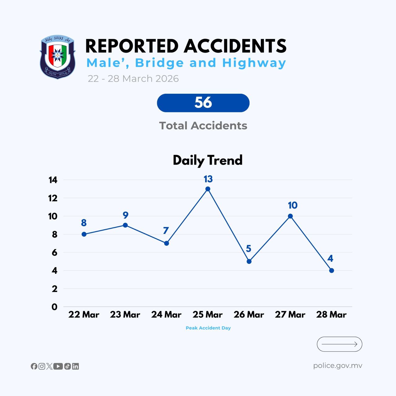 ފާއިތުވި ހަފުތާގައި މާލެއާއި، ސިނަމާލެ ބުރިޖާއި ހައިވޭ ހިމެނޭގޮތަށް ޖުމުލަ 56 އެކްސިޑެންޓް ހިނގާފައިވާ ކަމަށް ފުލުހުން ބުނެފިއެވެ.