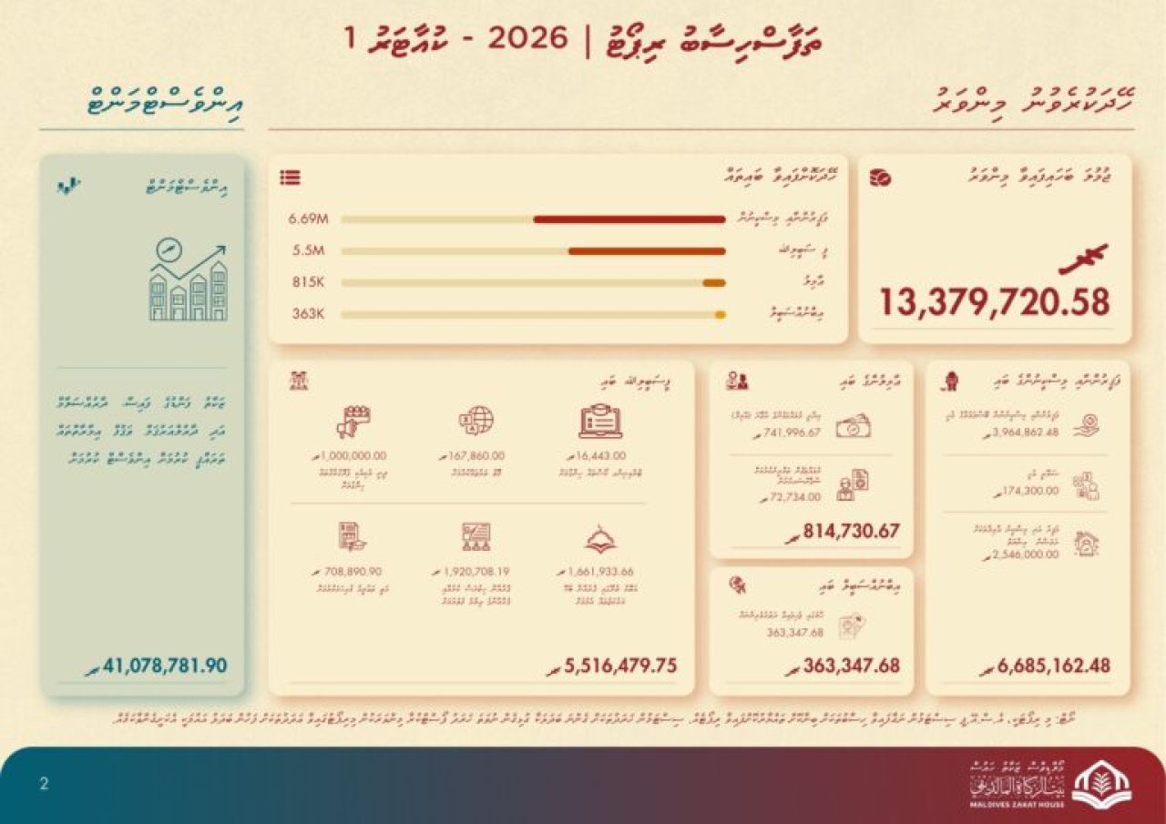 ޒަކާތު ހައުސްއިން މިއަދު އާންމުކުރި ރިޕޯޓުގައި، އިޖުތިމާއީ އަދި ދީނީ ކަންކަމަށް ޒަކާތު ފަންޑުން ފައިސާ ހޭދަކުރެވުނު ގޮތުގެ ތަފްސީލު ވެސް ވަނީ ހިމަނާފައެވެ. އެގޮތުން ބޭސްފަރުވާގެ އެހީއާއި، އަސާސީ ބޭނުންތަކާއި، ރަމަޟާން މަހުގެ އެހީއާއި، ގުރްއާން ހިތުދަސްކުރުމުގެ ޕްރޮގްރާމްތަކާއި، ތައުލީމީ އެހީގެ އިތުރުން އިޖުތިމާއީ ތަރައްގީގެ މަޝްރޫއުތަކަށް ޖުމުލަ 13,379,720.58 ރުފިޔާ ހޭދަކޮށްފައިވެއެވެ.