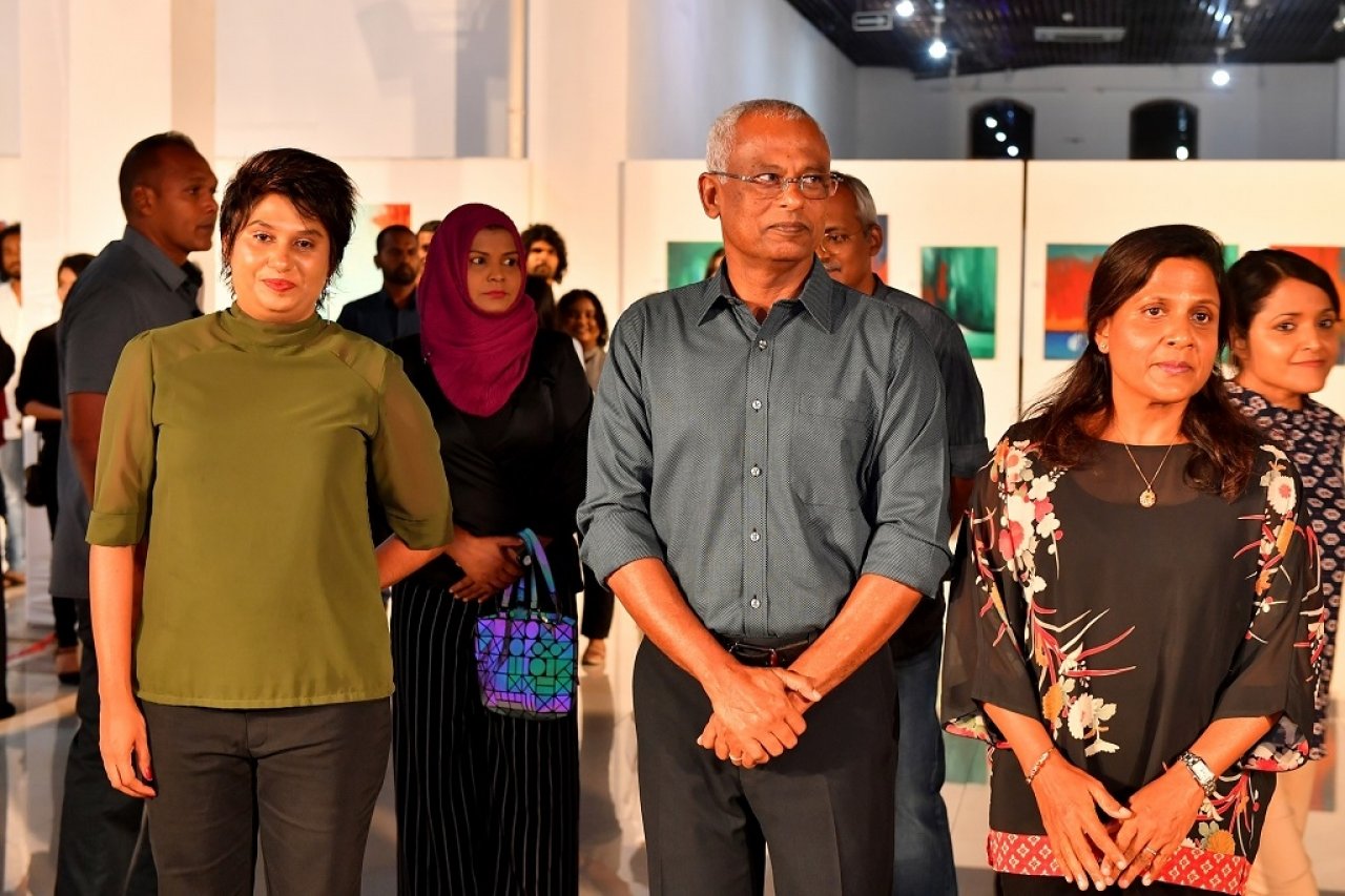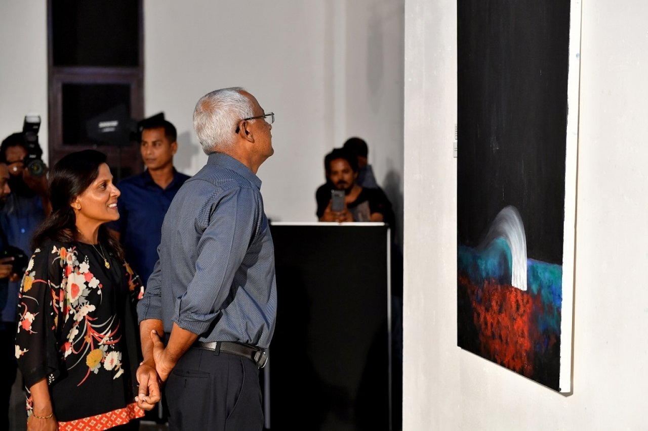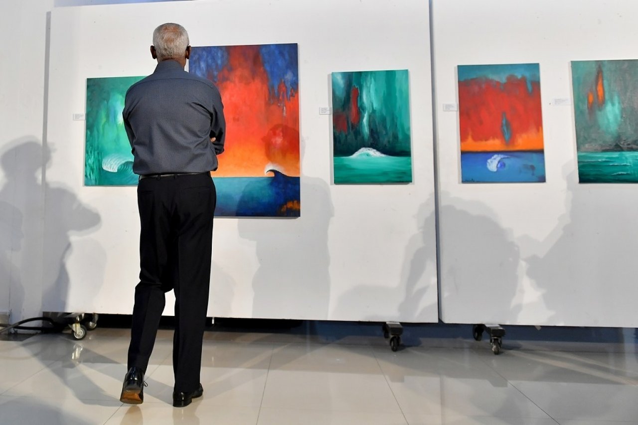'އަ ވަލްނަރަބަލް ބިއުޓީ - މޯލްޑިވްސް އެގްޒިބިޝަން' ރައީސްގެ ދެކަނބަލުން ހުޅުއްވައިދެއްވުމުގެ ތެރެއިން އާޓްސް މިނިސްޓަރު ދުންޔާ މައުމޫން / ފޮޓޯ: ރައީސް އޮފީސް