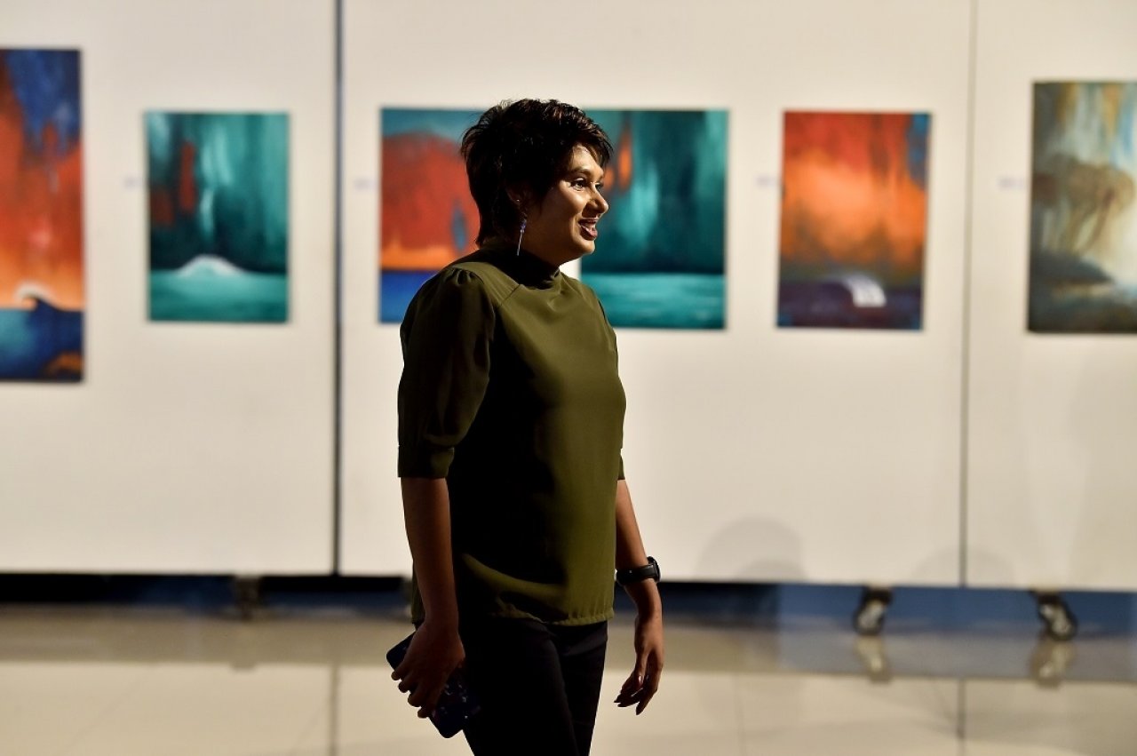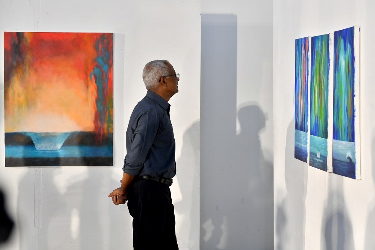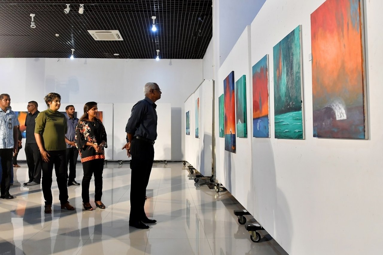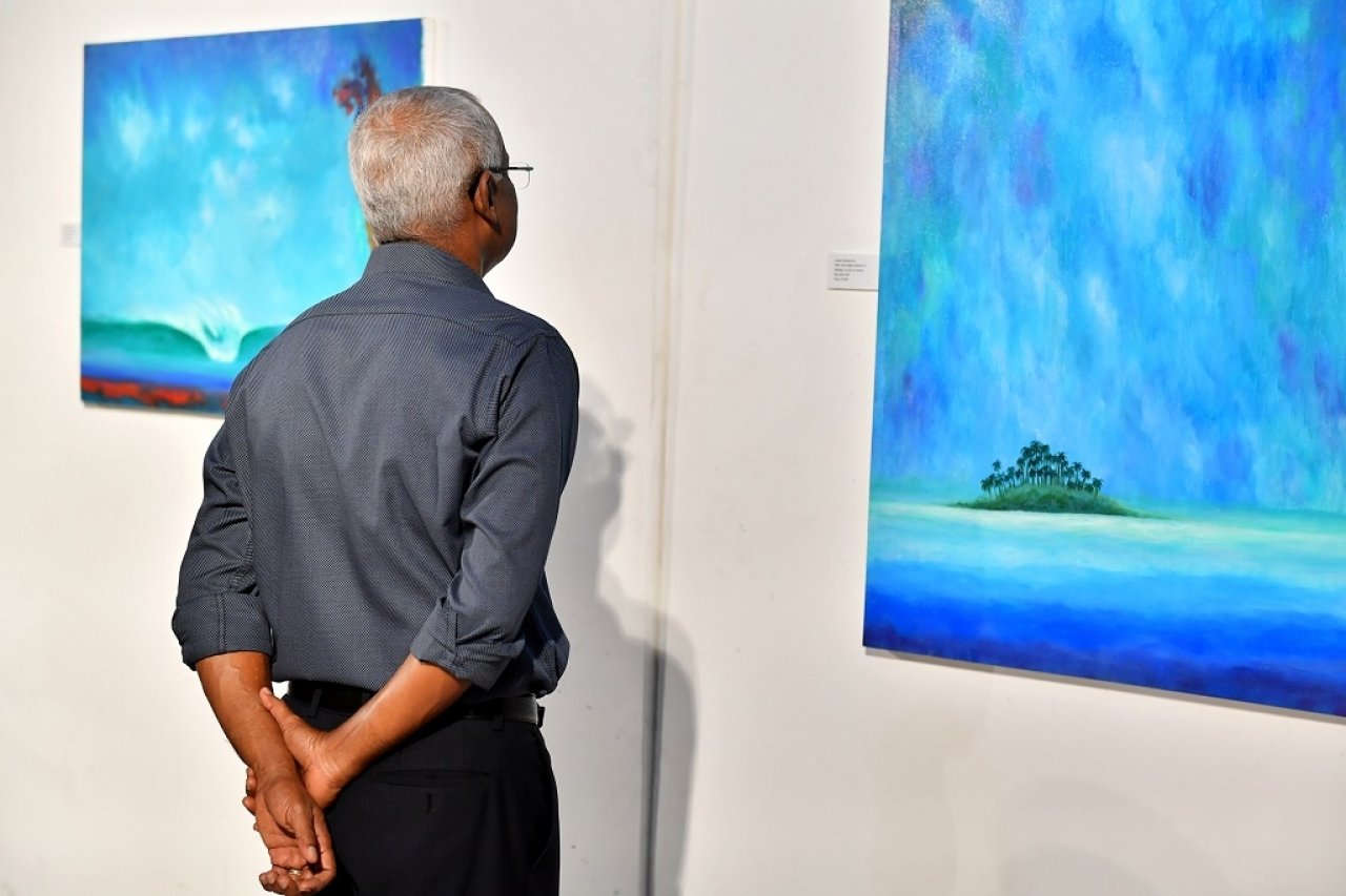 'އަ ވަލްނަރަބަލް ބިއުޓީ - މޯލްޑިވްސް އެގްޒިބިޝަން' ރައީސްގެ ދެކަނބަލުން ހުޅުއްވައިދެއްވުމުގެ ތެރެއިން އާޓްސް މިނިސްޓަރު ދުންޔާ މައުމޫން / ފޮޓޯ: ރައީސް އޮފީސް