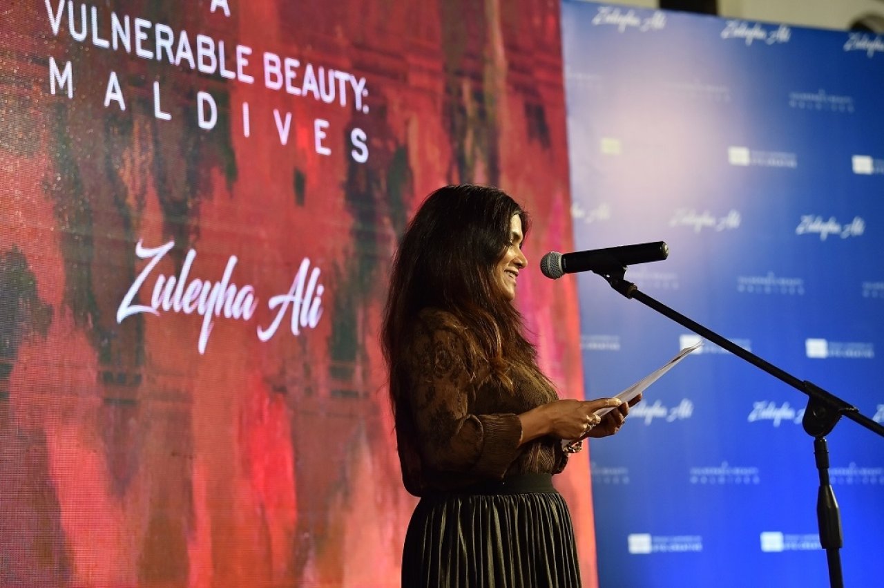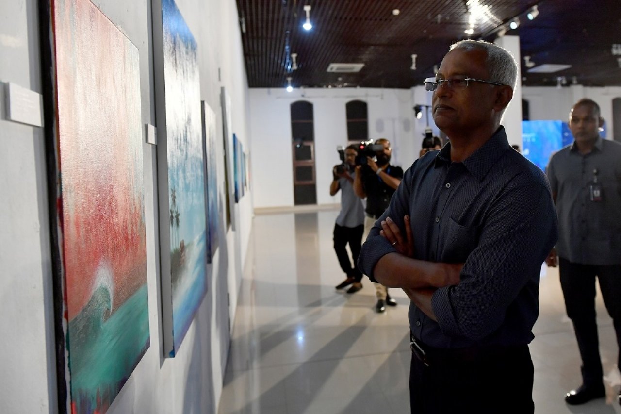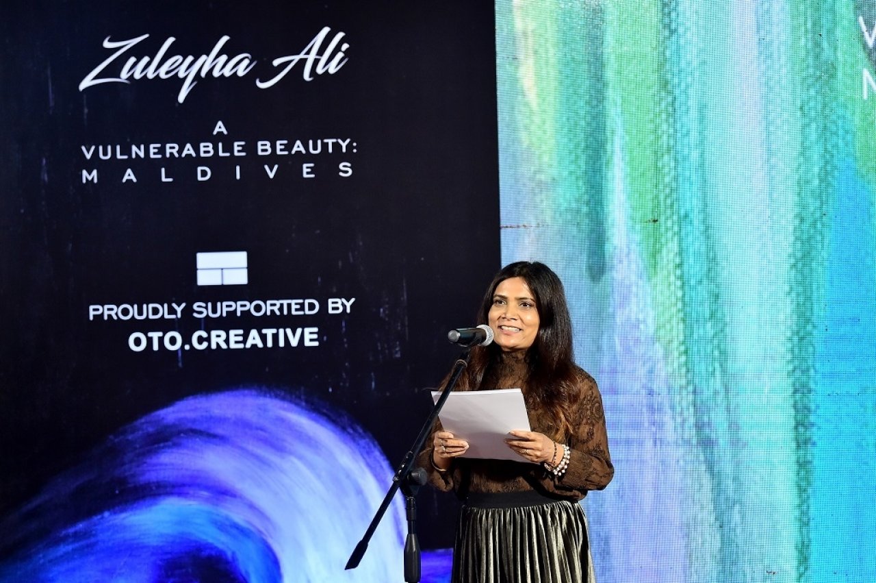 'އަ ވަލްނަރަބަލް ބިއުޓީ - މޯލްޑިވްސް އެގްޒިބިޝަން' ރައީސްގެ ދެކަނބަލުން ހުޅުއްވައިދެއްވުމުގެ ތެރެއިން އާޓްސް މިނިސްޓަރު ދުންޔާ މައުމޫން ވާހަކަ ދައްކަވަނީ / ފޮޓޯ: ރައީސް އޮފީސް