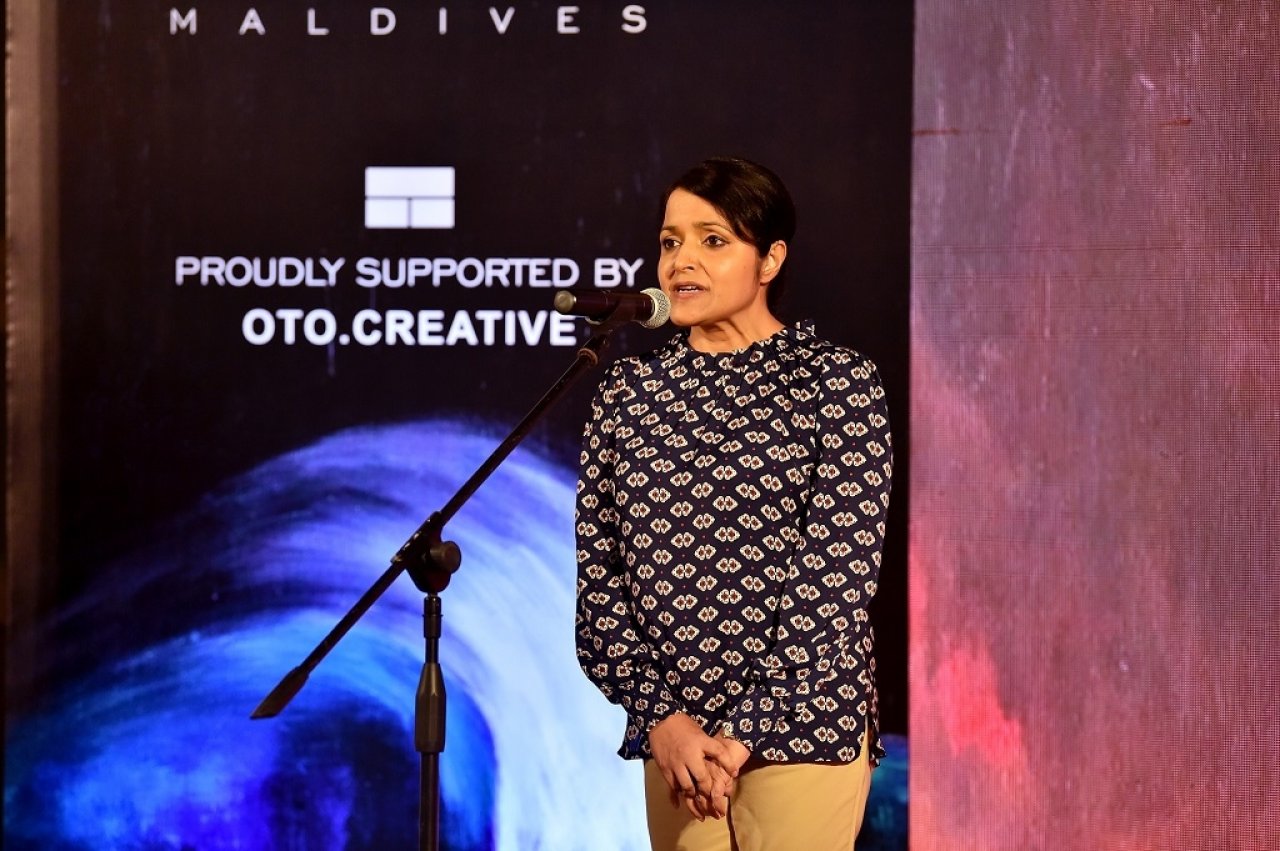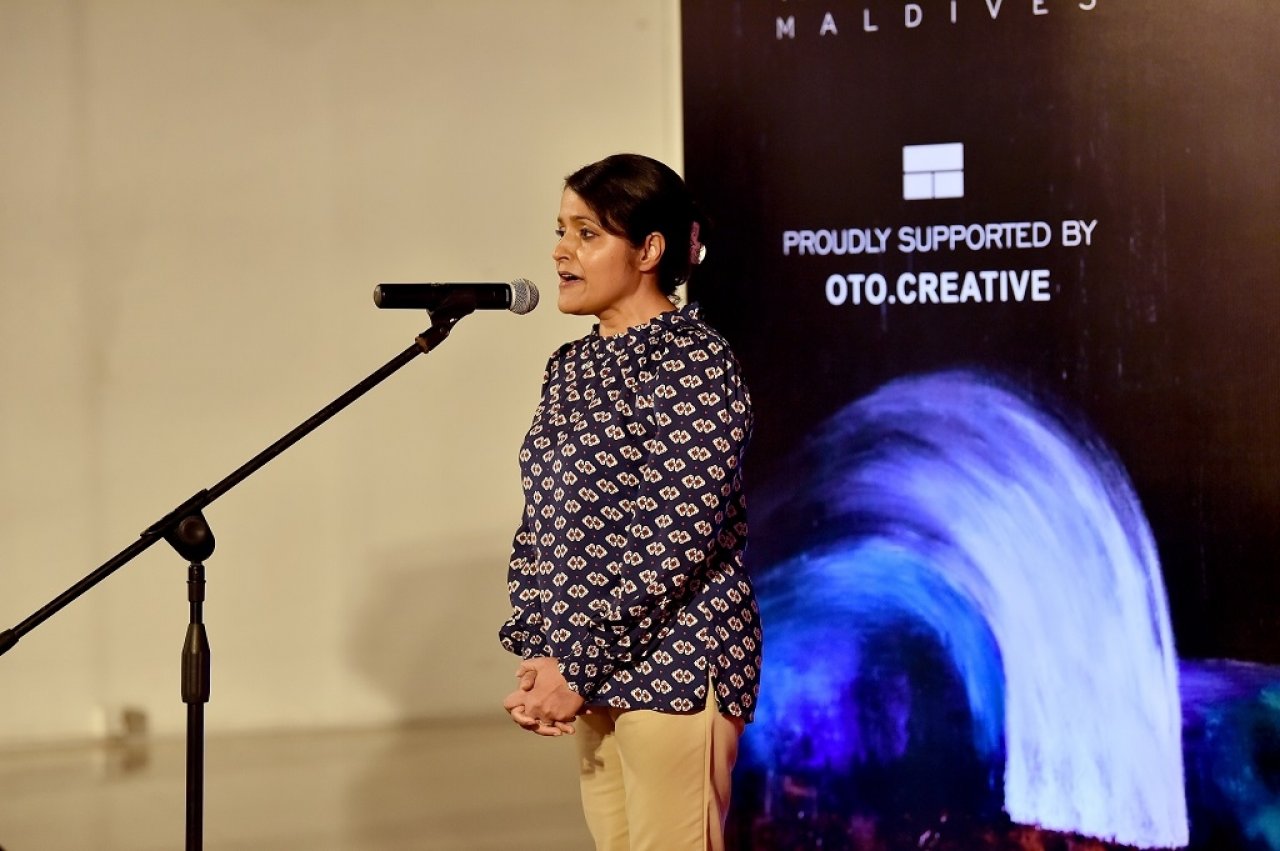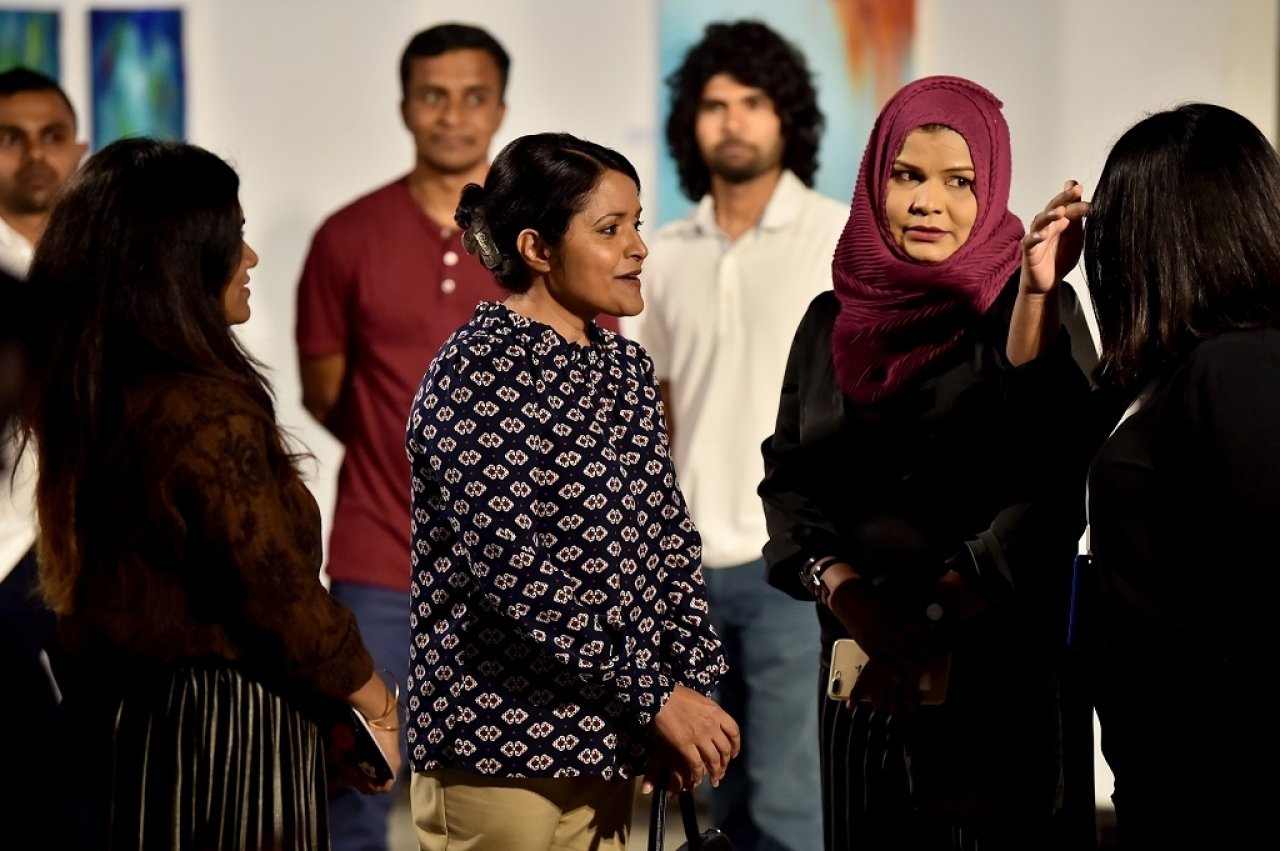 'އަ ވަލްނަރަބަލް ބިއުޓީ - މޯލްޑިވްސް އެގްޒިބިޝަން' ރައީސްގެ ދެކަނބަލުން ހުޅުއްވައިދެއްވުމުގެ ތެރެއިން އާޓްސް މިނިސްޓަރު ދުންޔާ މައުމޫން ވާހަކަ ދައްކަވަނީ / ފޮޓޯ: ރައީސް އޮފީސް
