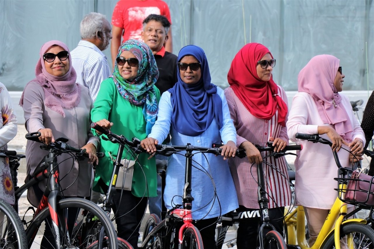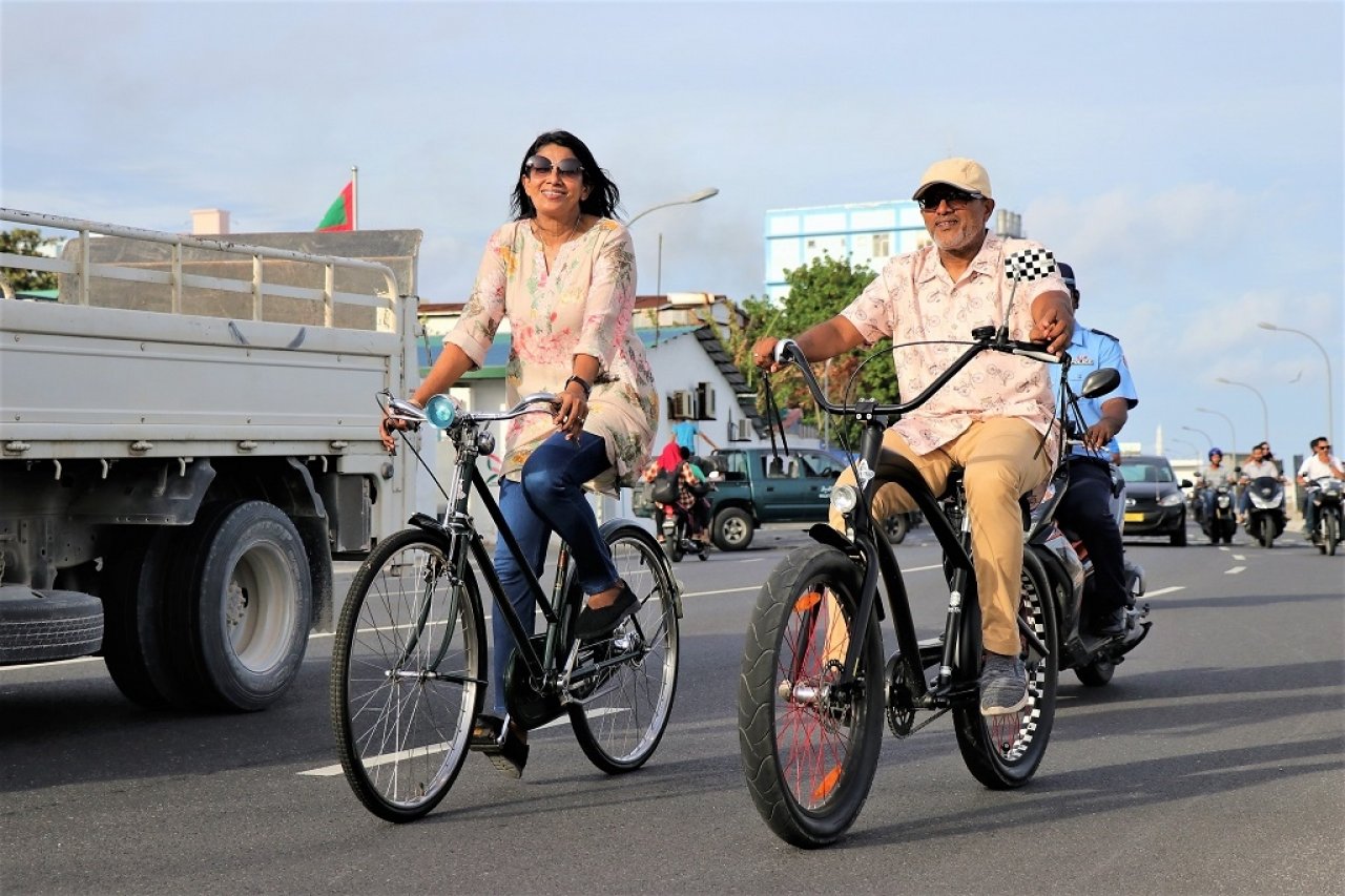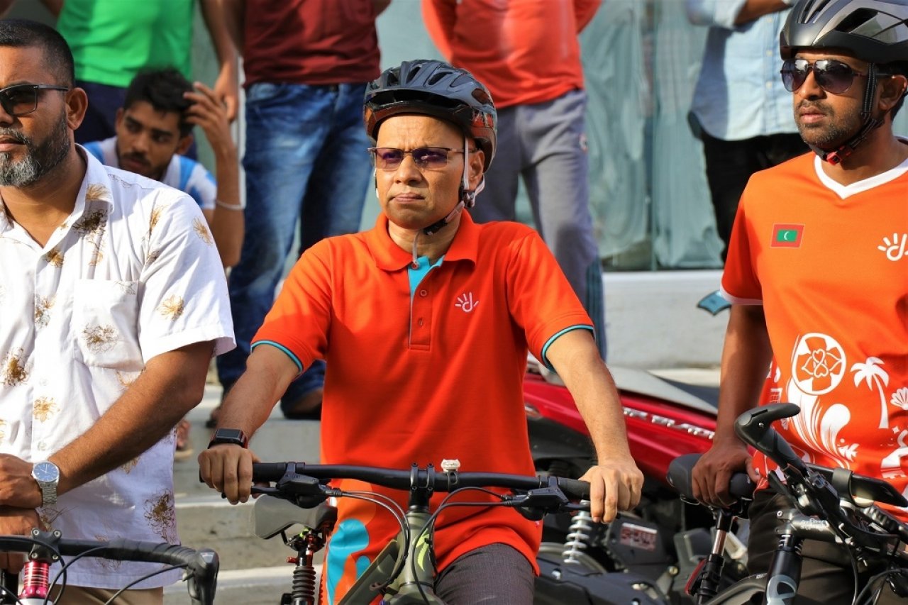 އެންވަޔަރަމަންޓް މިނިސްޓަރު ޑރ. ހުސައިން ރަޝީދު (ކ)، ޓްރާންސްޕޯޓް މިނިސްޓަރު އައިޝަތު ނަހުލާ (މ) އަދި ބައިކް މޯލްޑިވްސްގެ ރައީސާ (ވ) / ފޮޓޯ: ހުސައިން މަޚްތޫމް | ދަ ޕްރެސް