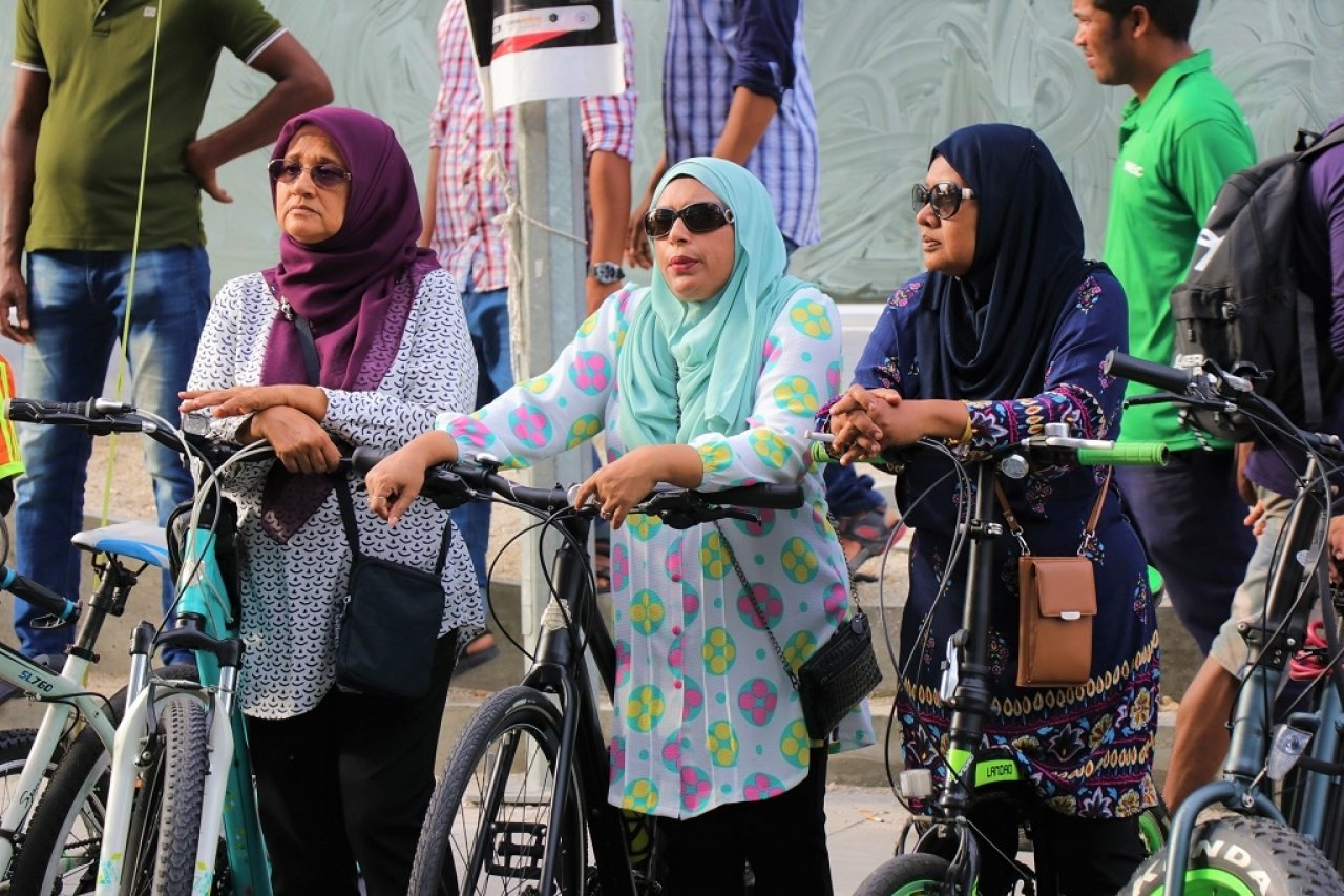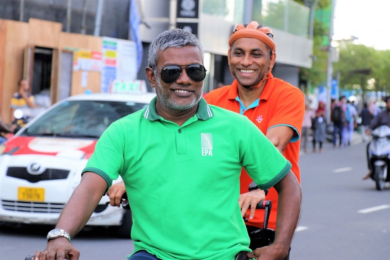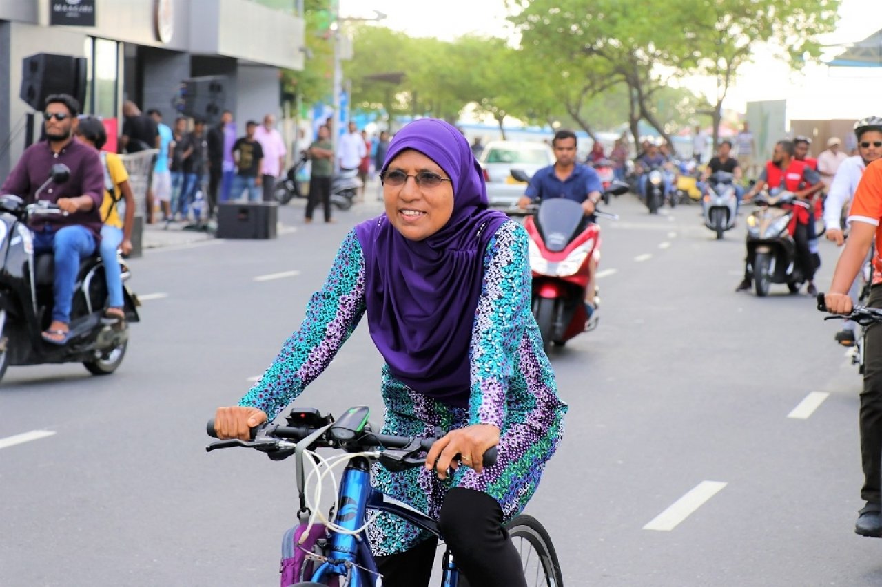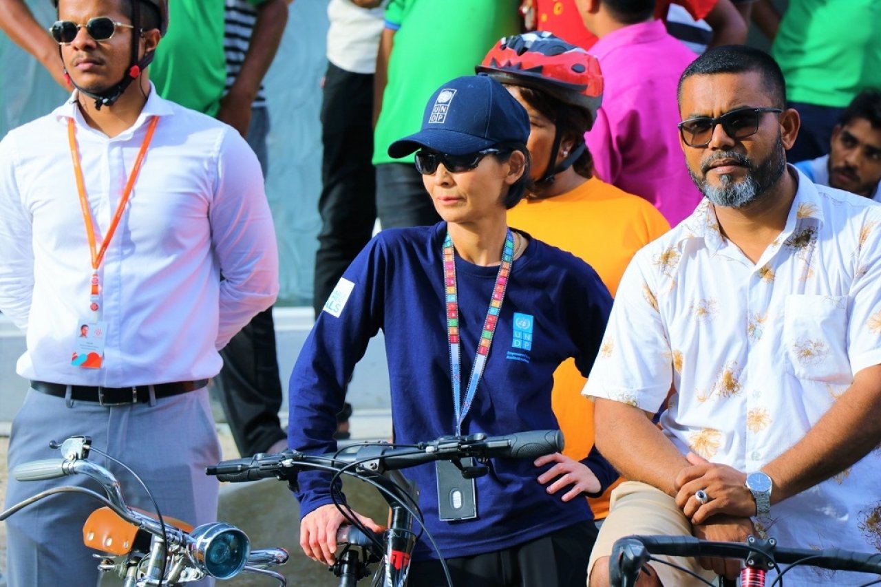 އެންވަޔަރަމަންޓް މިނިސްޓަރު ޑރ. ހުސައިން ރަޝީދު (ކ)، ޓްރާންސްޕޯޓް މިނިސްޓަރު އައިޝަތު ނަހުލާ (މ) އަދި ބައިކް މޯލްޑިވްސްގެ ރައީސާ (ވ) / ފޮޓޯ: ހުސައިން މަޚްތޫމް | ދަ ޕްރެސް