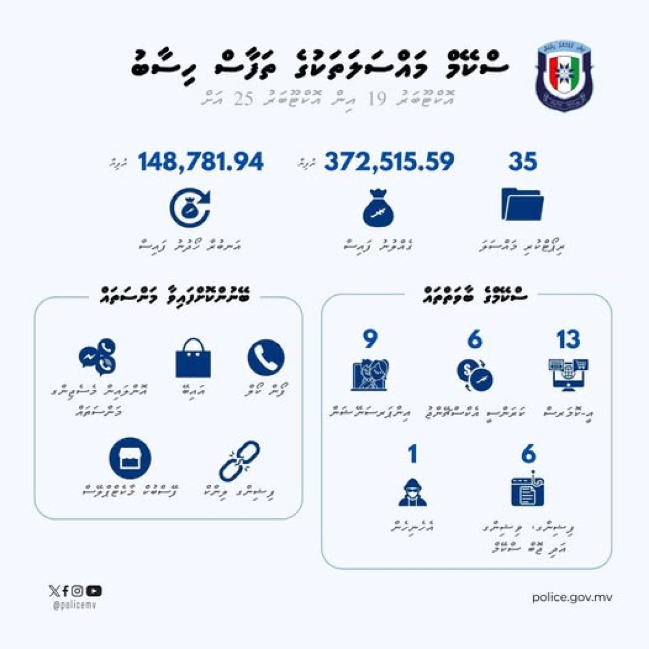މި މަހުގެ 19 ވަނަ ދުވަހުން ފެށިގެން 25 ވަނަ ދުވަހާ ހަމައަށް ފުލުހުންގެ އެންޓި ސްކޭމް ސެންޓަރުން އާންމުކޮށްފައިވާ މައްސަލަތަކުގެ ތަފާސްހިސާބުތައް ދައްކާ ގޮތުން ސްކޭމްގެ 35 މައްސަލައެއް ރިޕޯޓުކޮށްފައިވާއިރު އެ މައްސަލަތަކުގައި ޖުމްލަ 372،515.59 ރުފިޔާ ވަނީ ފޭރިގެންފައެވެ.